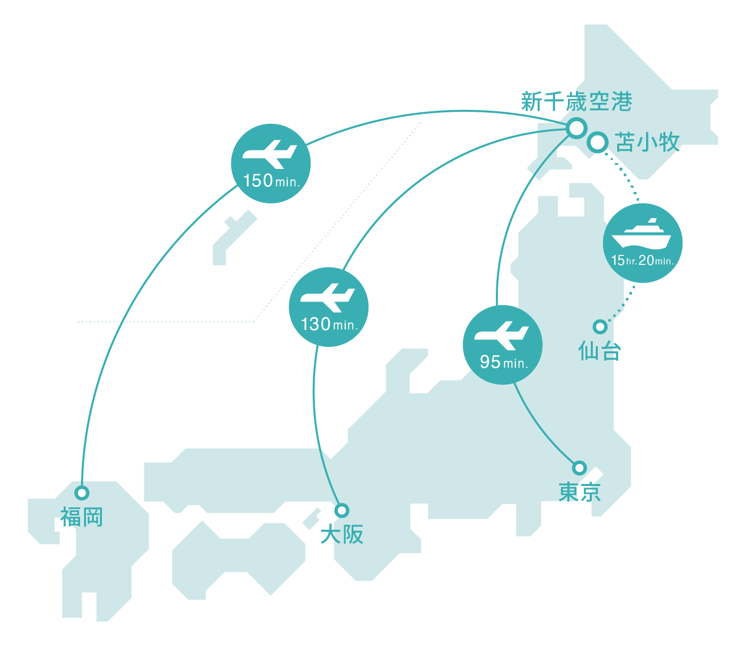北海道は大きな離島ではありますが、飛行機をはじめ、新幹線やフェリーなど交通網は発達しています。一番多い交通手段は飛行機で、遠く九州から移動しても、2時間ちょっとあれば辿り着けます。日程に余裕があれば、ゆったりフェリーの旅でも面白いかも!