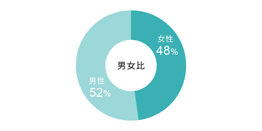 男女比は男性が52%、女性が48%とほぼ差はありません。北海道でリゾートバイトする男女比率はバランスが取れた構成になっています。