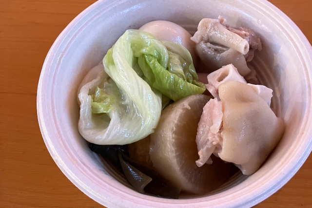 長時間煮込んだトロトロのてびち(豚足)と菜っ葉が特徴の島おでんです。出汁が染みたてびちはまさに絶品!