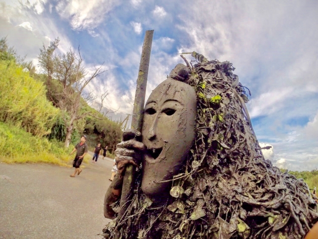 宮古島では、警察官の格好をした人形が街のあちこちに立っています。20体ほどあり、顔立ちもそれぞれ異なります。台風で吹っ飛ばされることもありますが、島の交通安全を見守ります。