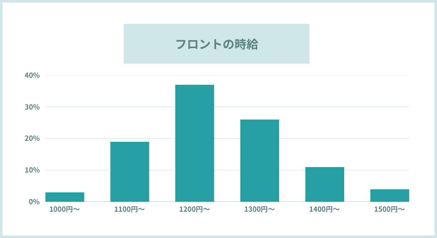 2024年リゾバ.comのデータによると、フロントの平均時給は1257円。1ヶ月の給料目安は22万1232円(時給1257円×8時間×22日)となります。