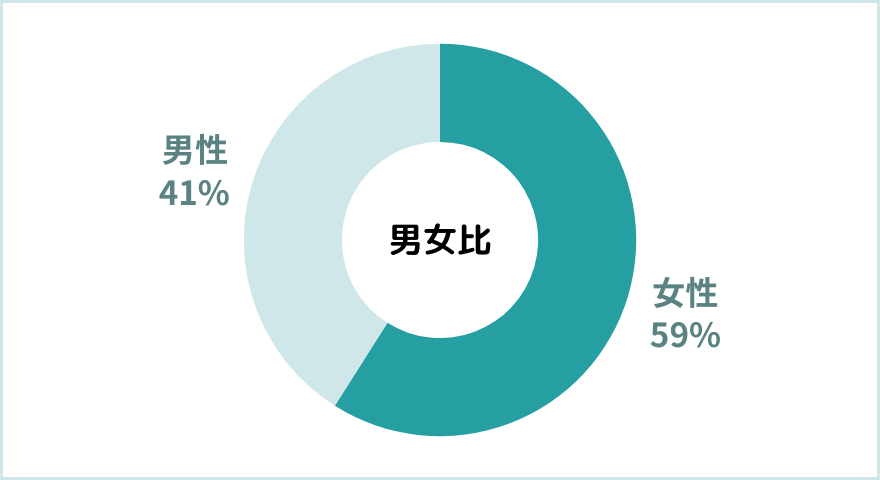 男性41%、女性59%とほぼ同じ割合で働いています。
