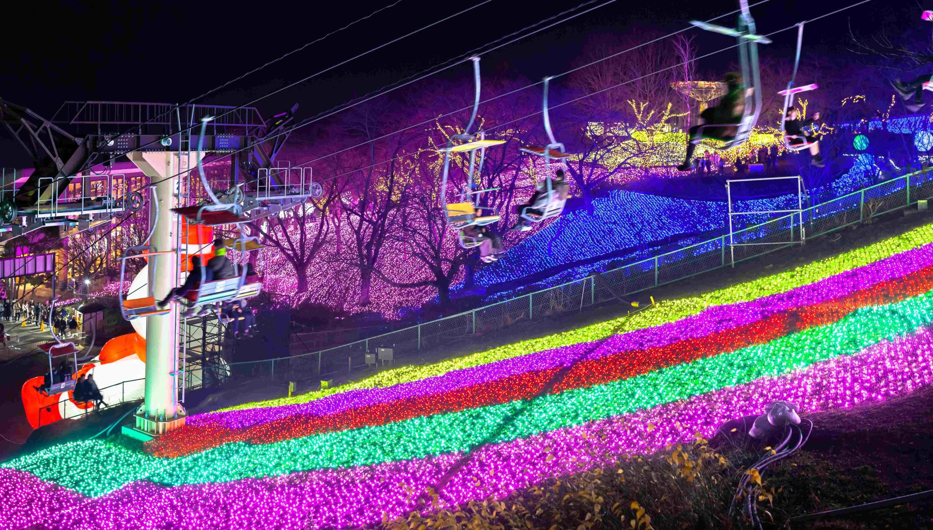 特に、虹色に光るイルミネーションの上をリフトに乗り、全長250mの空中散歩を楽しむのがおすすめです。