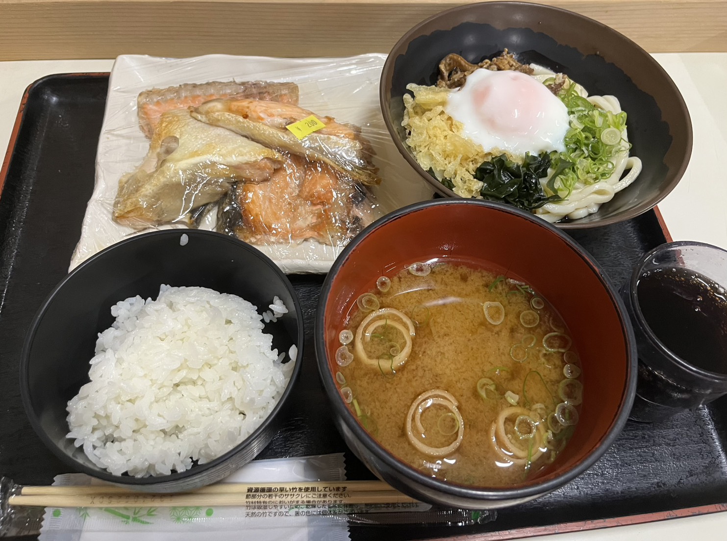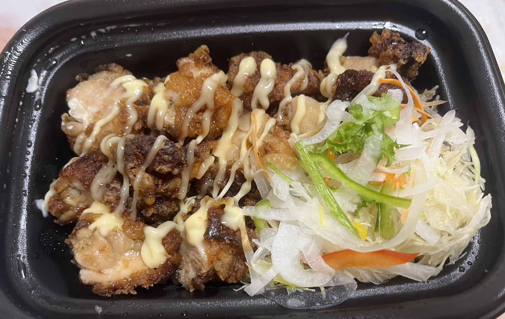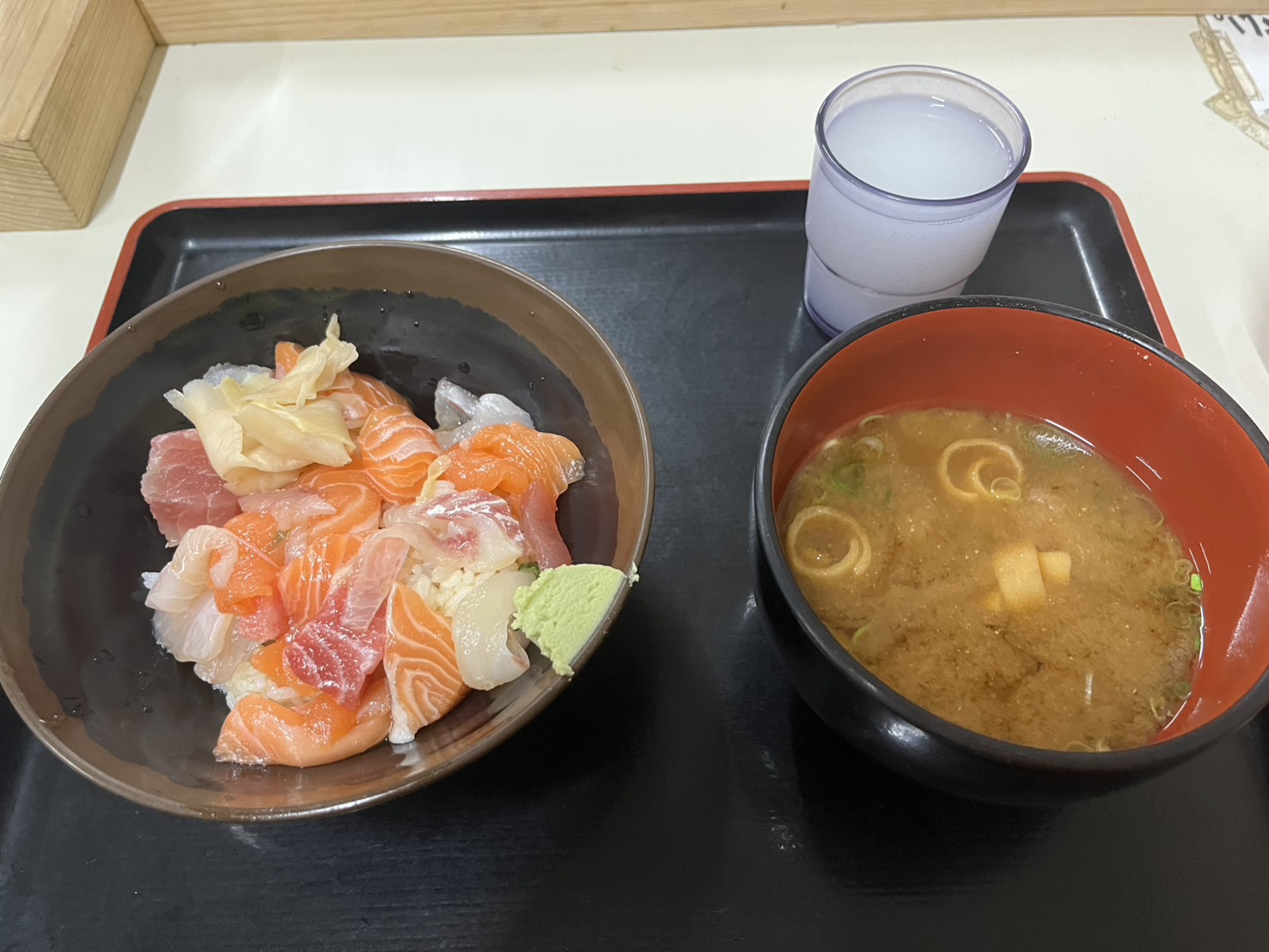 お昼は、お客様と同じ海鮮丼や副菜やラーメンを食べたり、夜ご飯は親子丼やおっきいマヨからあげやお肉、鮭などがありました。